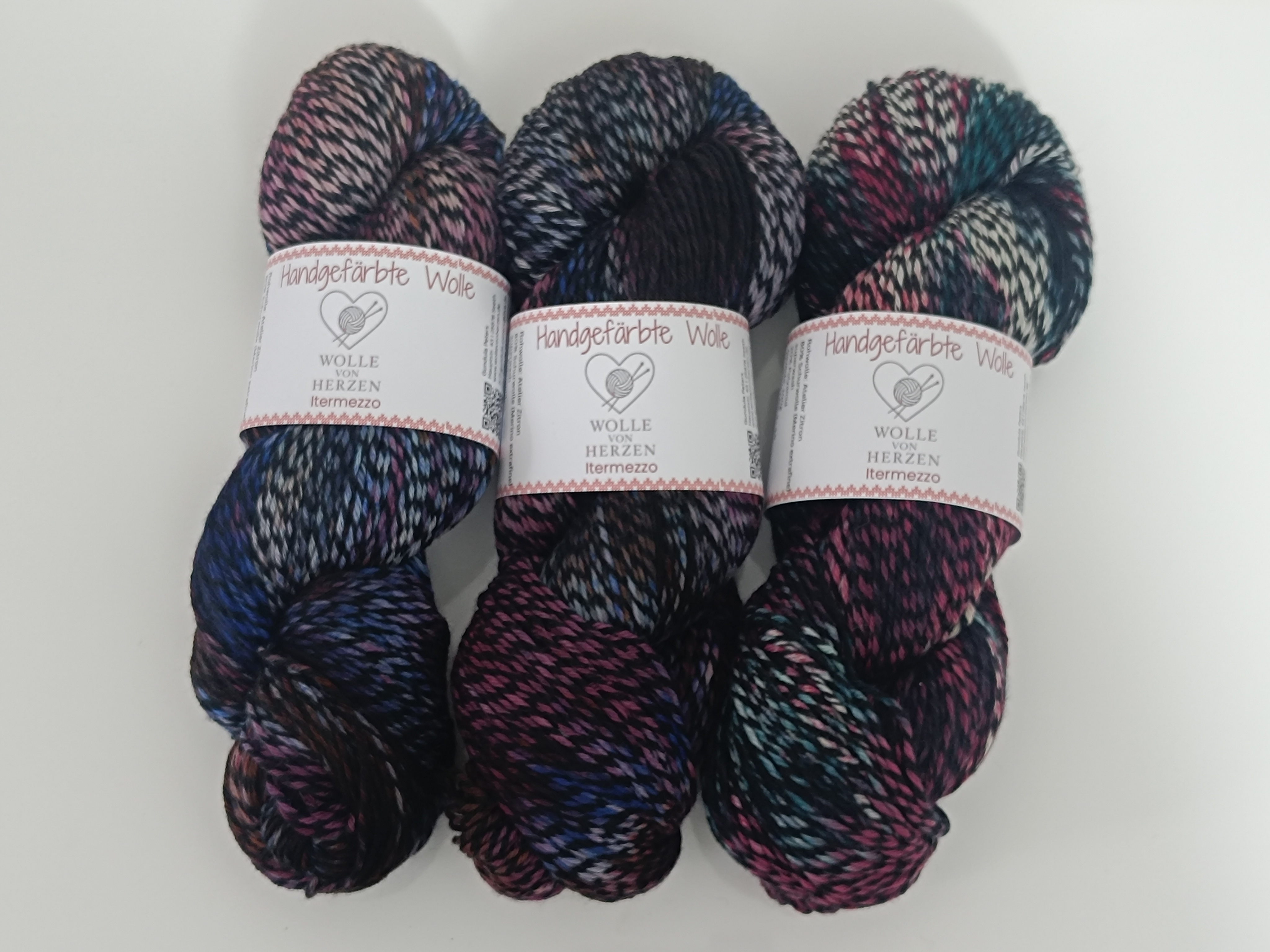 Die Wolle wurde mit professionellen Säurefarben unter Zugabe von Essigessenz handgefärbt.